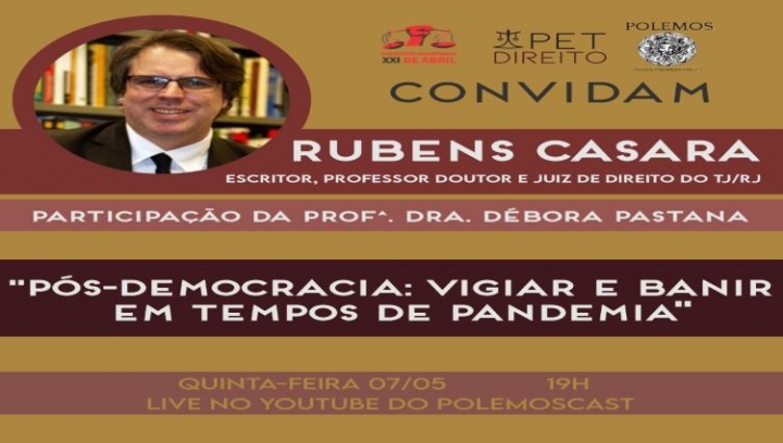 O PET Direito, o Diretório Acadêmico XXI de Abril e o PolemosCast convidam os Professores Rubens Casara e Debora Pastana para debate: Pós-democracia: Vigiar e Banir em tempos de pandemia