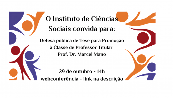 O Instituto de Ciências Sociais tem a honra e satisfação de convidar para Defesa Pública de Tese do Prof. Dr. Marcel Mano, em sua promoção à Classe de Professor Titular.